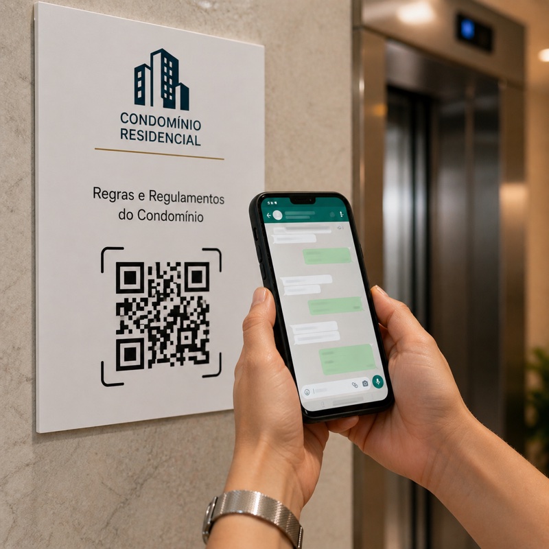 A plataforma gera um QR Code exclusivo para cada condomínio. Imprima e coloque nos murais, elevadores e áreas comuns. O morador escaneia, informa nome e unidade no WhatsApp e já está cadastrado. Sem app, sem senha.